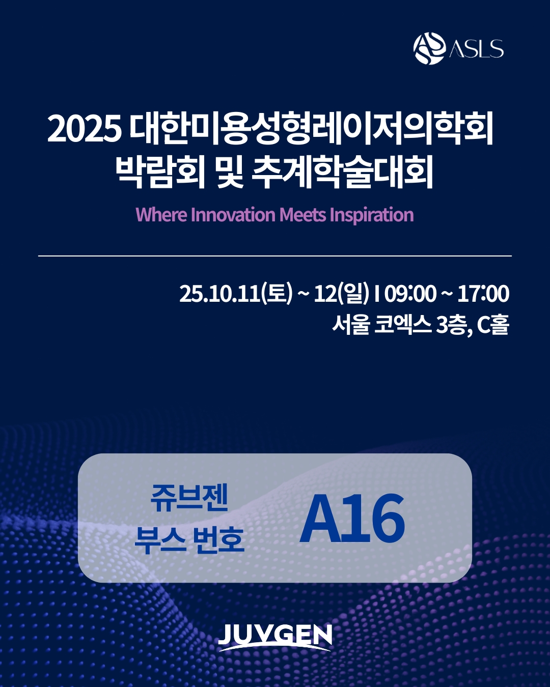 현장에서 JUVGEN의 혁신 기술과 임상 데이터를 직접 확인하시고, 전문 담당자와의 비즈니스 상담 기회도 만나보세요.